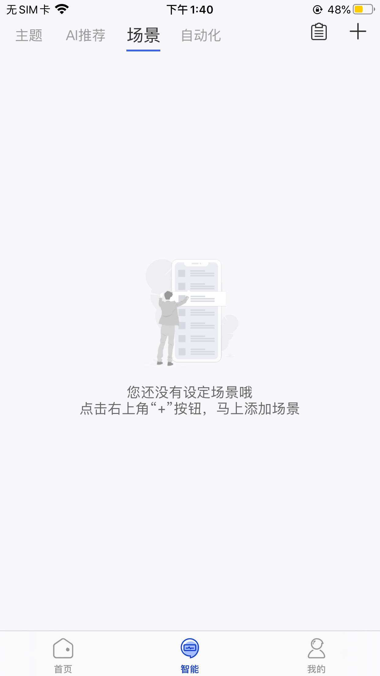 <智能>页:点击【智能】按钮进入 <智能>页,点击右上角的【+】按钮,进入 <添加智能场景>页。