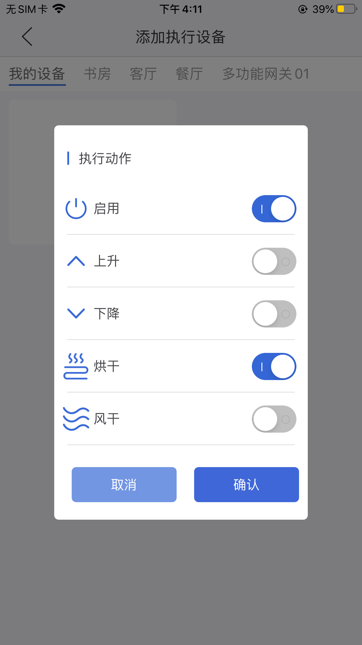 <添加执行设备>页:点击需要添加的设备,弹出 <执行内容>页。